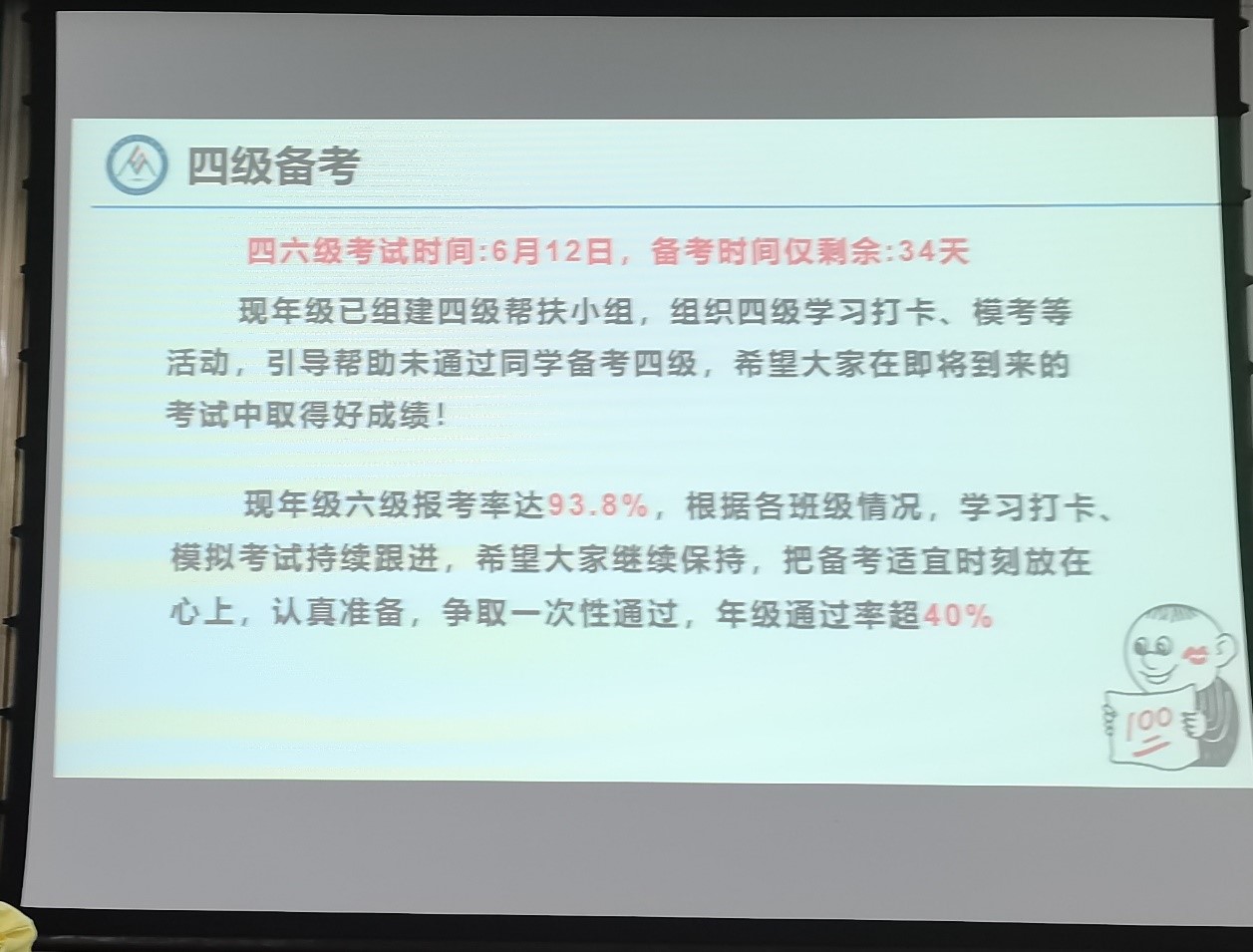 大会第三项,辅导员代宇欣动员对四六级考试进行动员。首先是诚信学习问题,最近各科期中考试正在进行中,希望同学们端正学习态度,诚信考试,通过期中考试成绩对近期学习情况做一个总结和反思。除此之外,距离四六级考试只剩最后一个月的时间,希望我们第一学期未通过四级考试的同学们再接再厉,争取第二学期实现全员通过的目标;通过四级考试的同学积极认真备考六级,希望我们六级通过率也能取得新的突破。