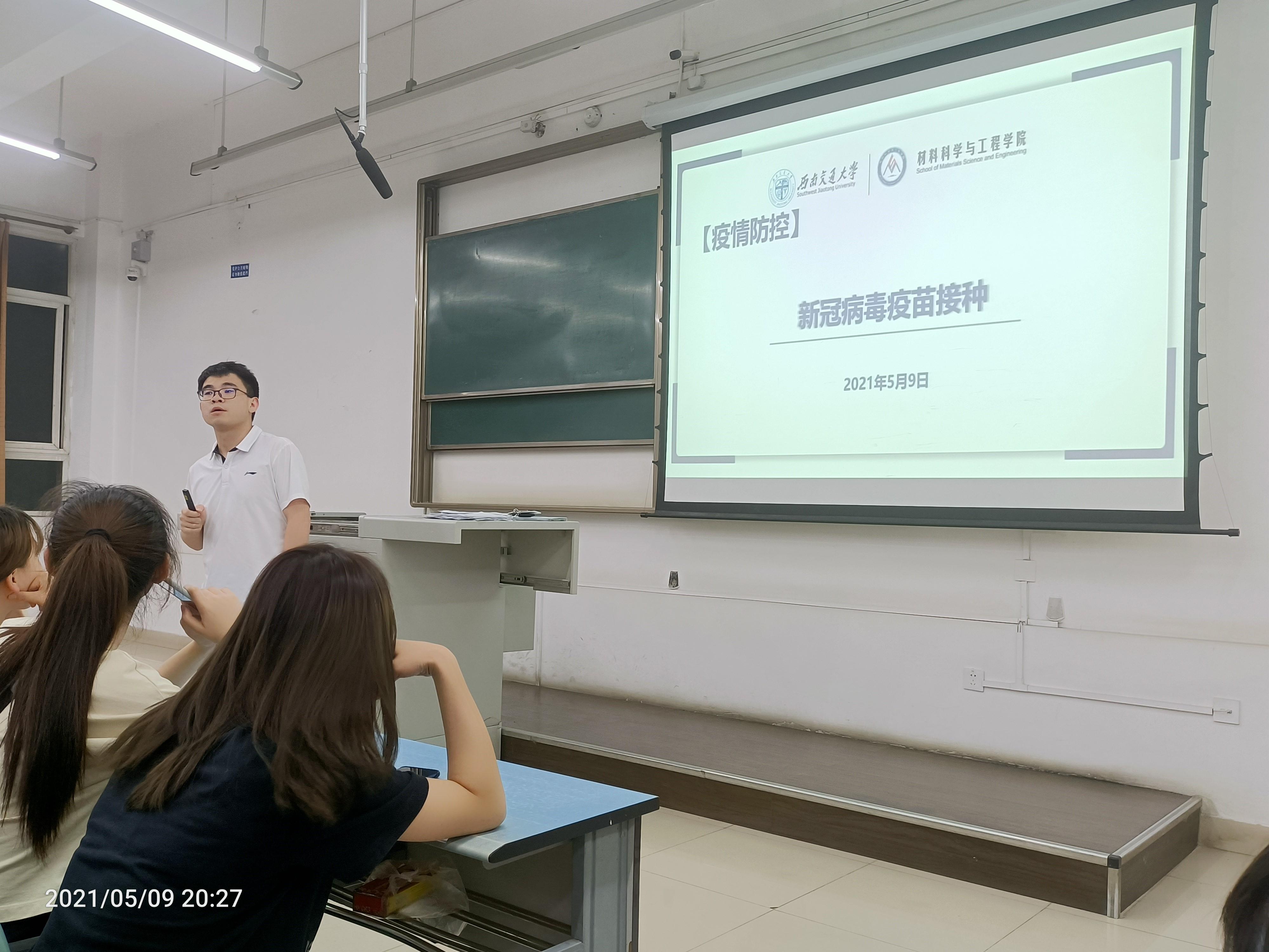 大会第五项,辅导员郑纪伟就接种新冠疫苗注意事项进行说明。郑纪伟老师向同学们详细说明5月11日上午新冠病毒疫苗接种的相关流程安排和本次接种的疫苗信息,并提醒同学们注意相关的接种禁忌和其他的注意事项。至此,会议圆满结束。