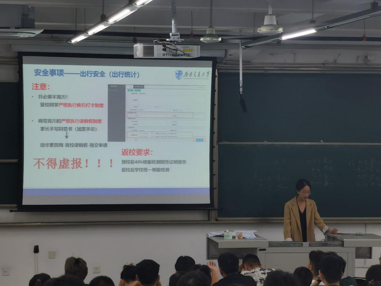 首先,由邓文婷为学生讲解安全事项,重点强调了出行安全。疫情防控阶段,建议学生非必须不得离开四川;如若离开四川,需严格执行请销假制度,并家长手写同意书(加盖手印)。其次强调宿舍安全问题,严禁使用违章电器。最后强调了电信诈骗安全问题,并让学生签署防范电信网络诈骗承诺书。