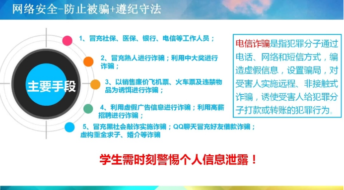 最后一点就是网络安全问题,大学生的网络安全意识一直是热点关注话题,网络上充满着许多诈骗信息及诈骗手段,学生必须时刻警惕,在网络上避免上当受骗,要时时刻刻注意保护个人信息,遵纪守法,保护好个人的财产及隐私安全。