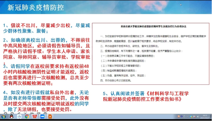 第二是疫情防控问题,由于近期全国疫情多点散发,疫情形势严峻复杂,学院要求同学们非必要不离校、不出川,必须按照学校要求做好个人防护,离川离蓉按照要求请假