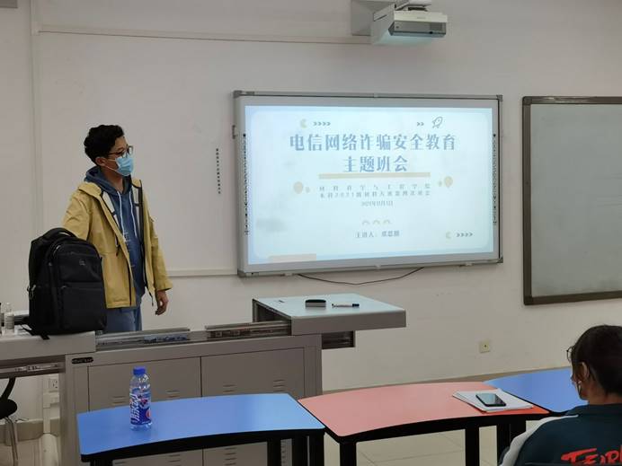 其次,许欢再次提醒大家注意网络诈骗,抵制诱惑,提高警惕。并根据学校近期疫情防控要求做出安排,提醒大家注意疫情防控,戴好口罩,减少聚集活动,非必要不出校门,出校门严格执行请销假手续。
