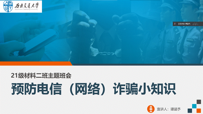 本科2021级13个班级按要求召开《安全教育主题班会——预防电信诈骗》,传达班团例会会议内容,重点普及网络诈骗相关知识,以身边的真实案例,提醒同学们要时刻防范网络电信诈骗。