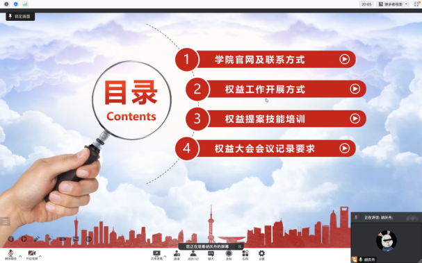 会议内容主要包括学院官网及联系方式、权益工作开展方式、权益提案技能培训、权益大会会议记录要求等。会议首先介绍了研究生生活中常见的权益维护内容,提出研究生如何维护自己权益的建议。其次,研究生会执行主席胡庆丹同学认真向权益委员们介绍权益部职能及同学们向权益部反馈问题的方式,同时提到,研究生会与权益委员是沟通桥梁、合作的关系,权益委员具体联系班级上的每一位同学,研究生会则负责对接相关解决问题的部门,同学们都应具有强烈的责任感,共同营造和谐友善的校园氛围,同时详细地向权益委员们介绍了学生维权的方法。