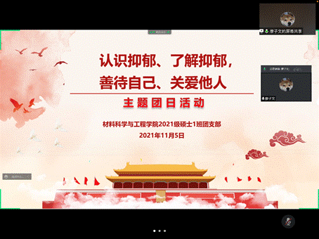 2021级研究生新生各团支部组织开展了“认识抑郁、了解抑郁,善待自己、关爱他人”主题特色团日活动。会议中,各班集体观看了《我们如何对抗抑郁》纪录片,让大家了解抑郁、认识抑郁进而去有效的解决每个人心理中的一些疑惑和不解。其次,各班就心理问题展开讨论,班委了解班上同学的近况,询问是否有一些相关的心理困惑,提议同学如果有疑惑可以进行相应正规的心理疏导。最后各班心理委员将收集到的问题整理汇总。
