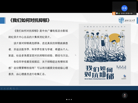 硕士4班团支部于线上开展了《我们如何对抗抑郁》相关主题心理活动,由硕士四班心理委员徐佳乐担任主持人。活动分为观看纪录片及同学近况询问两部分。