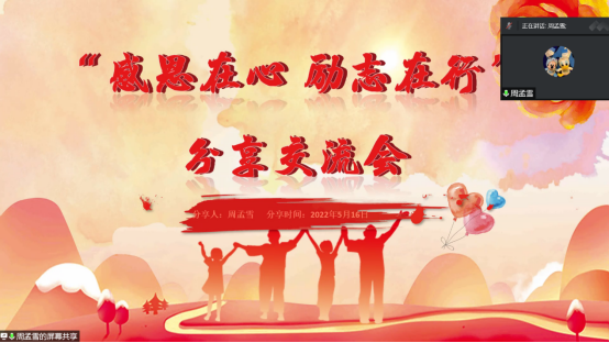 的周孟雪先从父母、老师、朋友、社会和生活五个方面阐述了自己对感恩的理解,并结合自身实际情况分享了时间管理的方法,讲述自己的励志故事。周孟雪最后讲到,希望每位同学都能够担苦、担难、担重、担勇,能够保持乐观积极的心态面对复杂的环境,踏踏实实做事,在复兴征程中绽放青春异彩。