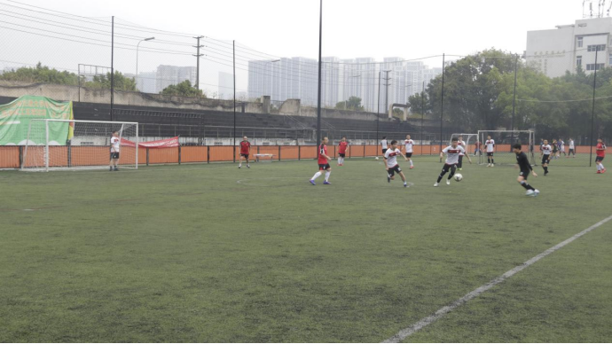 师生对足球运动的热爱。在比赛开始前,选手们一一握手,各队的队员们满怀激情,有序地热身并且相互练习传切配合,为比赛积极做着准备。