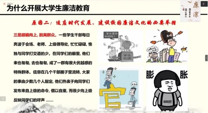 主办的以“洁身自爱、行稳致远——做清正廉洁学生干部”为主题的廉洁文化分享会在线上如期举行,由学校纪委办公室副科级纪检监察员胡博老师担任主讲人。此次分享会还邀请了包子漫画
