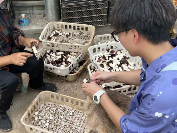 8月10日下午,实践队员调研参观食用菌公司,观摩学习当地稻菌轮作、菌菌轮作的生产机制,以及加工、销售的完整体系。在经理带领下,队员们进入大棚基地参观认识各类食用菌及其生长条件、生长状况。在加工车间参观时,队员们也有幸上手体验村民的工作。据悉,该公司为村民提供了许多灵活就业岗位,增加了村民收入,为村子经济发展做出贡献。
