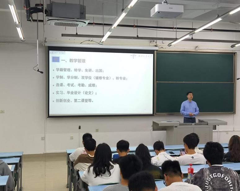 首先由蒋小松老师为2023级新生们进行教学管理规范解读,其中包括学籍管理、转学、免研、出国、学分、转专业、选课、成绩、考试等一系列教学相关规定,帮助同学们全面了解了学校教育教学相关制度。其次,蒋小松从学生管理和实验室安全管理两方面为同学们讲解了学院相关规章制度,要求同学们认真学习本科生管理制度,做一名遵纪守则的合格大学生。最后,蒋小松为同学们解读了大学的学习规划——从生活、学习、适应、方法、实践等几个方面深入展开。蒋小松分享了自己的学习经验与方法,他告诉同学们要积极探寻适合自我的学习方法,同时要将所学知识运用到实践中,才能真正掌握它。他还鼓励同学们要敢于面对挑战,勇于突破自我,不断拓宽自己的视野。