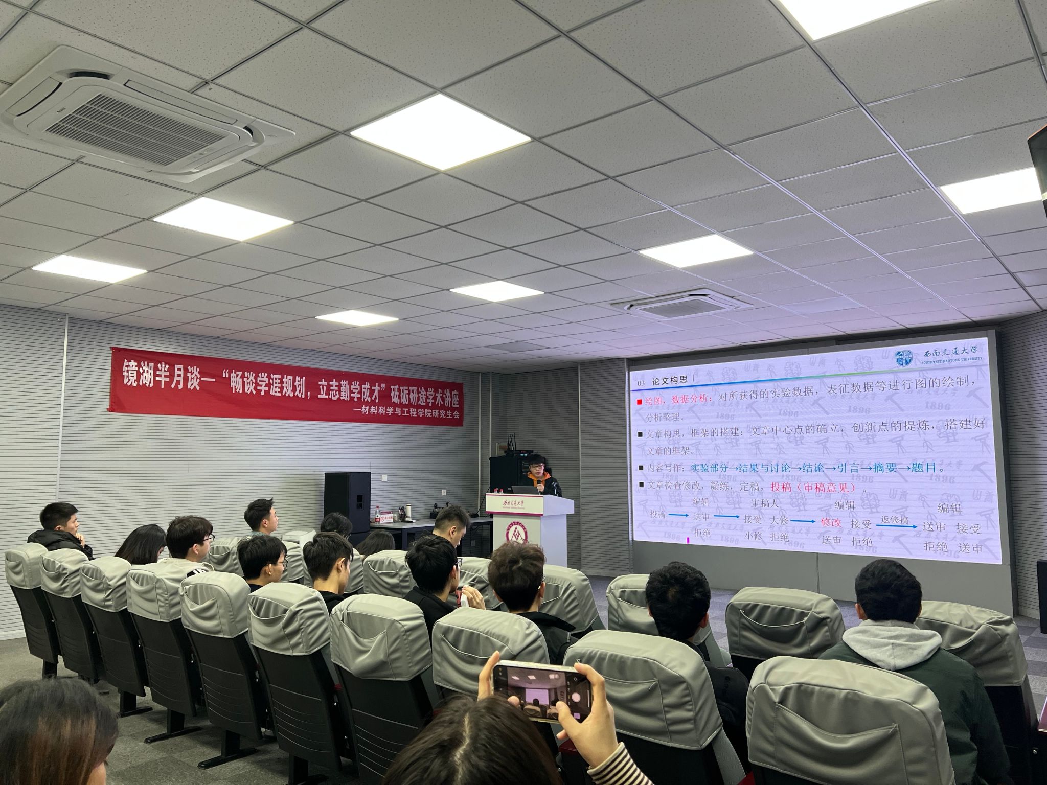 学院青年讲师团成员陈瑶同学从课题调研、实验开展和论文构思等方面展开讲述。建议同学们在研究生学习期间,早点动手实验并及时整理分析数据,勤加思考,与导师和师兄师姐讨论,同时告诫同学们切勿浅尝辄止,读研期间要有主观能动性,要针对性补充课题相关的基础理论知识,主动学习需要掌握的软件以及作图方法。