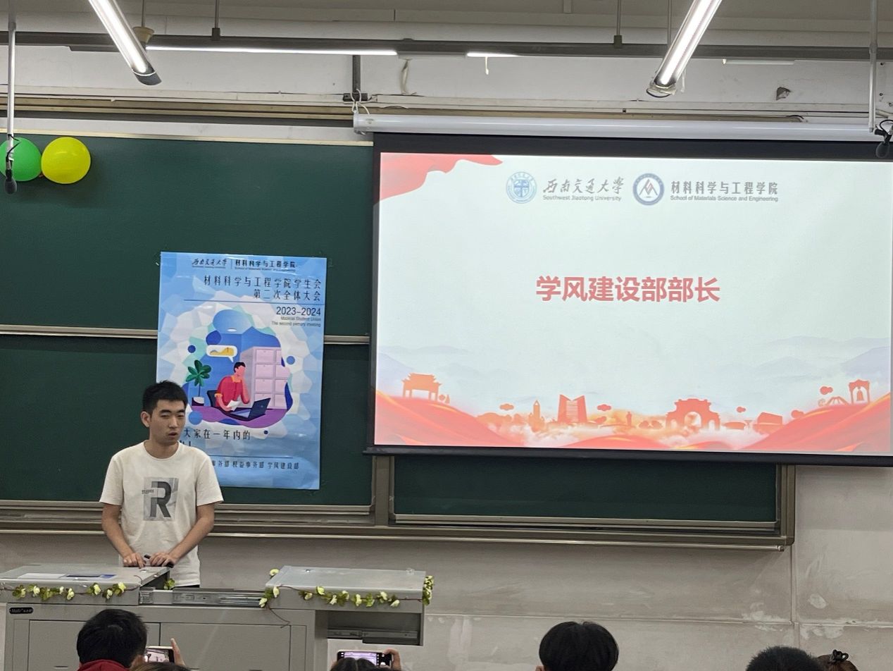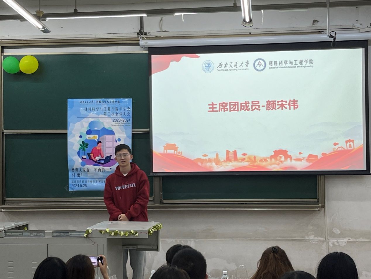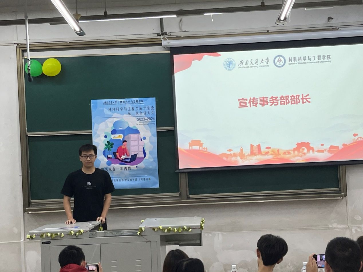 会议伊始,台下一片其乐融融、有说有笑的景象。在这样轻松愉快的氛围中,大会进行第一项议程:本届学生会主席团成员发言。三位主席团成员贺靖、石瑾,颜宋伟依次上台总结了过去一年的工作情况,对学生会的未来发展做出了指导。其中,颜宋伟同学以自身长期担任学生干部的经历,给同学们分享了独到经验,提出了后续加强宣传部建设的建议。