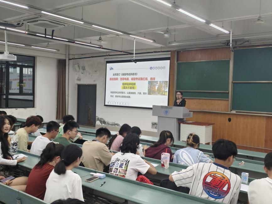 学生纪律处分规定》和分享警示案例进行教育。她表示,良好的考风考纪不仅关乎我们个人的学业发展,也体现了我们的个人素质和道德品质。希望同学们好好复习,诚实守信,认真准备四六级和期末考试,预祝同学们考出理想成绩。最后全体同学签订《诚信考试承诺书》。