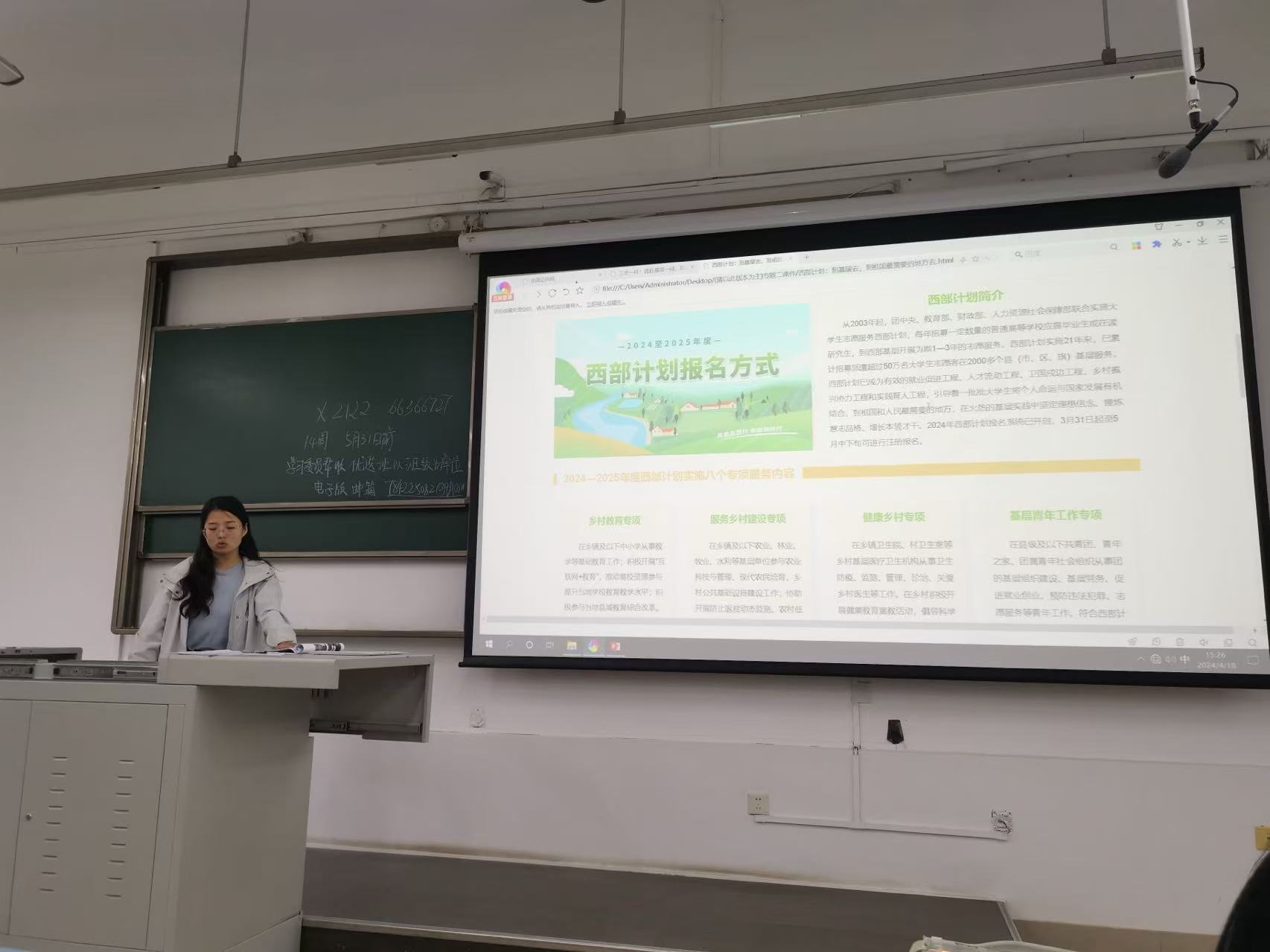 宣讲会上,王誉静对西部计划进行了介绍,西部计划是党中央、国务院高度关注的工程,旨在实践育人、促进就业、推动人才流动和助力扶贫,鼓励同学们响应国家号召,到西部、基层和祖国最需要的地方去。