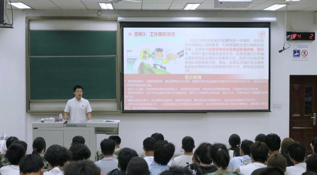 活动以“线下讲座+线上案例展播”相结合的形式开展。在安全教育环节,罗霁轩围绕国家安全、保密安全、消防安全、金融安全、交通安全、人身安全及抵御和防范校园传教渗透知识等展开讲解,通过庄重又不失风趣的语言,剖析一系列安全案例并提出解决办法,让新生直观了解安全风险,掌握“隐患早发现、危险会规避、意外能处置”的实用技能。同时,针对常见的校园贷、传销式非法集资等问题,结合“裸贷”“杀熟”等案例,手把手教新生识别诈骗话术,提醒大家“不轻信、不透露、不转账”,守护好个人金融安全。
