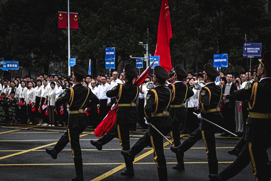 以极具视觉冲击力的画面(如仪仗队的整齐队列、护旗时的专注神情、国旗飘扬的场景),引发观者对“青春担当”的情感共鸣,让大众看到新时代高校青年并非抽象的“担当者”,而是具象为这些在国旗前挥洒汗水、恪守仪式的鲜活个体,进而唤起更多人对青年责任与家国情怀的思考。借助交大这一高校场景,传递“竢实扬华 自强不息”的校训理念,激励更多同学以挺膺之姿,在各自领域为国家发展、精神传承贡献力量,同时也展现学校在培育青年担当意识、厚植爱国情怀方面的育人成果。