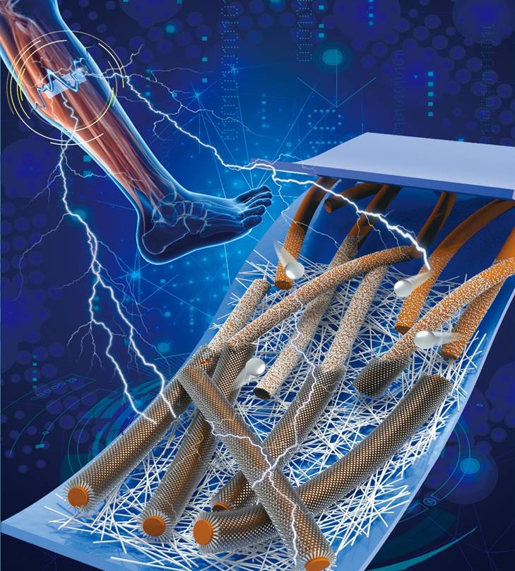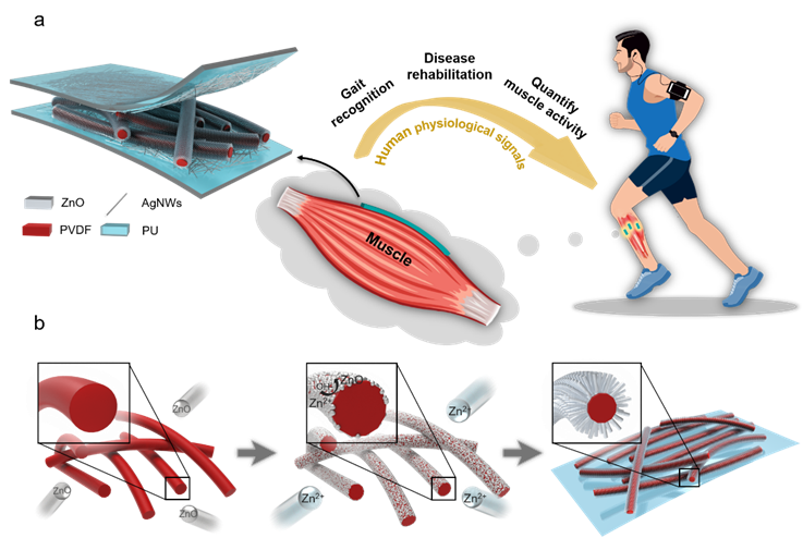 图1. 三维多级互锁PVDF/ZnO纳米纤维柔性压电传感器在人体肌肉监测的示意图