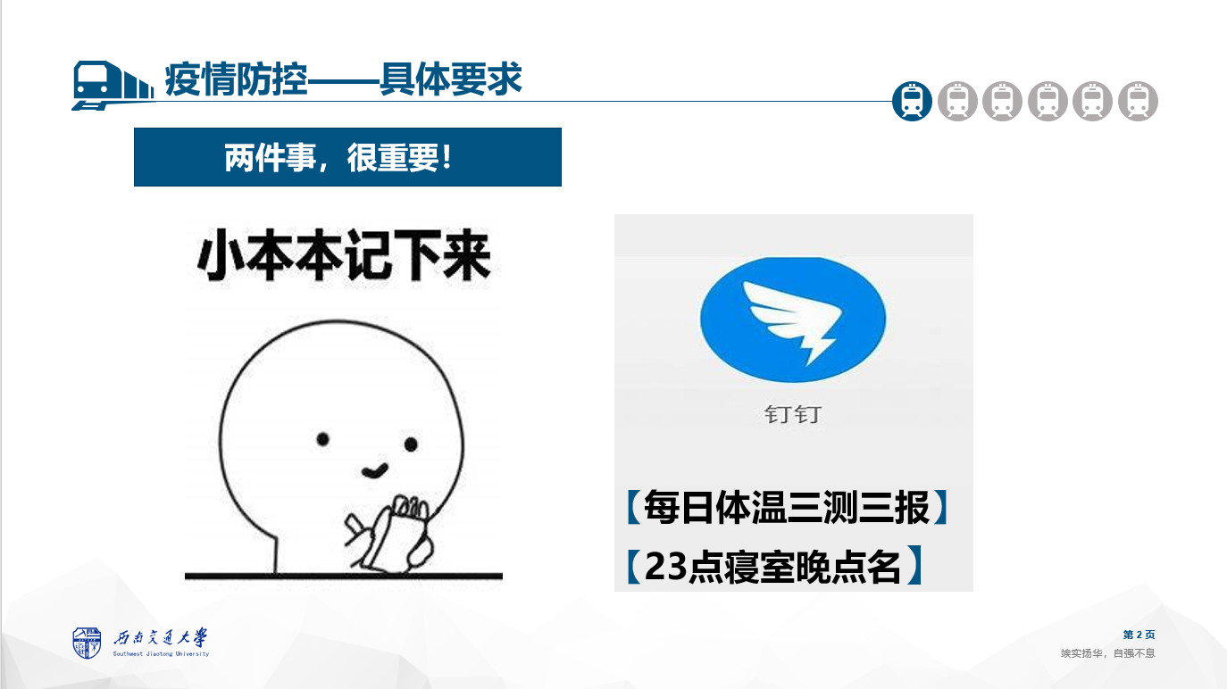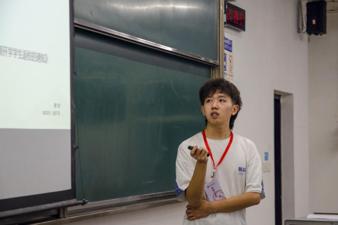 接着,年级助理李子浩学长向同学们讲解学校疫情防控规定,要求同学们做好每日体温三测三报和23点寝室晚点名,按规定在年级钉钉群中填表打卡;并着重强调了体温异常处理办法。