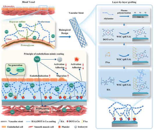 黄楠/杨志禄教授联合江苏大学潘国庆教授,从内皮细胞仿生设计出发,通过层层接枝的方法,构建了一个具有双功能仿生的涂层,用于心血管类支架材料的表面改性,以期解决心长期困扰着心血管支架在长期植入过程中会出现再狭窄和晚期血栓的一个重要临床医学问题(图1)。在这项研究中,NO生成的Cu2+螯合DOTA和典型的糖萼组分透明质酸(HA)通过水连续逐层的固定在等离子聚烯丙胺(PPAm)涂层支架上。逐层接枝策略可以独立控制每个接枝层上的生物分子密度和含量,从而便于在多组分修饰中调整和优化表面功能。具体地说,DOTA单侧的羧基首先被用于与支架上PPAm的氨基偶联,剩下的羧基用于二次接枝。为了获得高的HA接枝密度,进一步利用PAa将羧基转移到多个氨基来放大反应位点。从而得到一个成分可控的且拥有高度内皮仿生的心血管支架涂层。