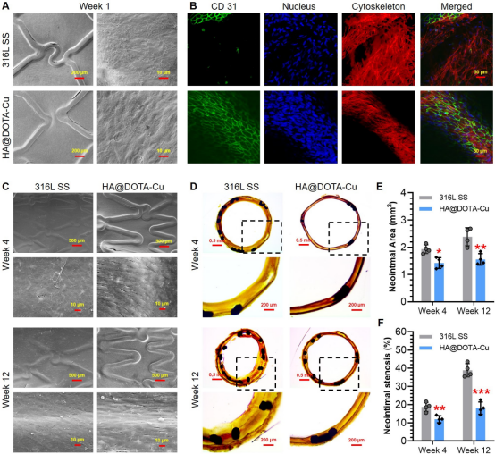 为了证实这种血管内皮仿生双功能表面功能化策略在促进内皮再生、抑制血管支架内膜增生和再狭窄方面的优势,作者概念性展示了血管支架表面双功能涂层的构建,即构建出可自催化产生一氧化氮(NO)和拥有模拟内皮糖萼主要成分的双功能涂层(图1)。论文中,作者借助血管内皮仿生双功能表面,NO释放速率可控和透明质酸优异的生物相容性及高度放生的策略,得到了具有最显著抗凝血、抑制平滑肌细胞增殖迁移、促进内皮细胞贴附的支架表面。体内研究进一步显示,通过血管内皮仿生双功能血管支架可有效快速地促进血管支架表面的内皮化(第1周)。在长期植入情况下(第4-12周),表面接枝有优化双功能组分的血管支架可以显著地抑制内膜增生和支架的再狭窄(图2)。这项研究最直接的意义是为心血管植入器械表面多功能仿生设计提供了理论支撑和指导;从应用的价值来看,该项工作将以往双因素仿生接枝中竞争位点,位点不足,接枝比例无法精确控制的缺点,通过巧妙的利用DOTA与层层接枝的策略成功转化为催化可控,接枝量可控的优势。本研究的积极成果不仅为多组分表面修饰提供了新的解决方案,而且也为血管内皮支架的仿生设计提供了新的思路,有望解决临床关键问题。