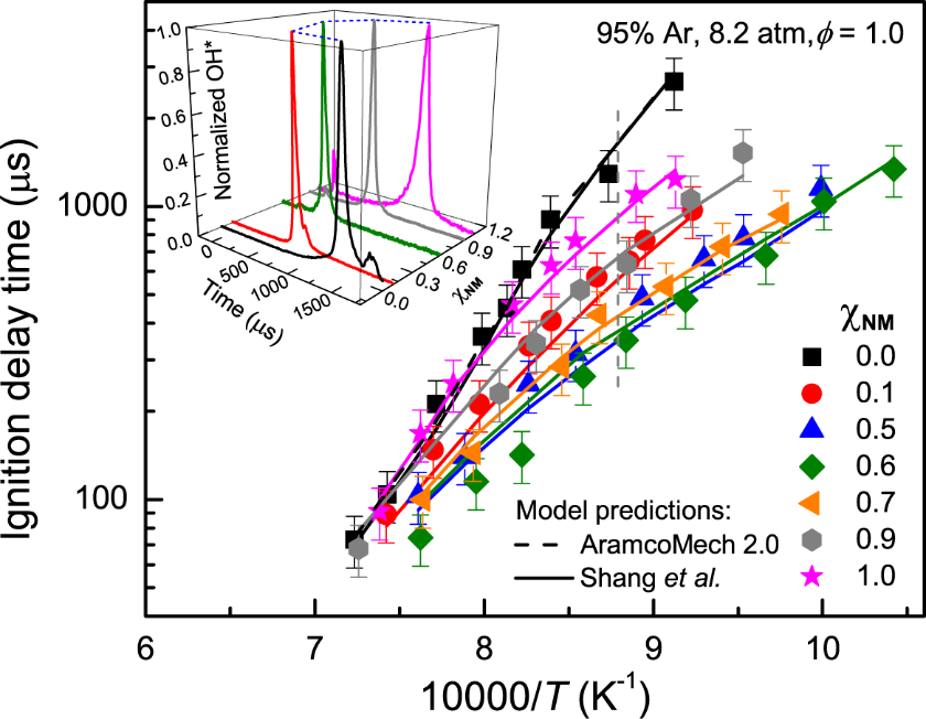 此外,点火延迟时间是燃料燃烧特性评价的重要指标之一,直接反映了燃料燃烧反应链诱发和链传递的动力学特征,对于验证和改进燃烧反应动力学模型具有重大意义。通过二元混合燃料硝基甲烷/乙烷的点火特性研究,研究发现乙烷点火特性并非随着硝基甲烷的掺混比增加而一直加快,反而呈现出一种少有的非线性关系(图3)。相关成果以“Abnormal promotion effect of nitromethane on ethane ignition”为题发表在Combustion and Flame上。博士研究生尚艳磊为论文的第一作者,甯红波助理研究员、史进春副研究员为共同通讯作者。