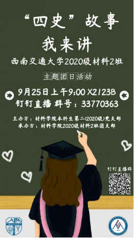 结合新生入学教育相关要求,促进新生适应大学生活、引导新生成长发展,全面提高综合素质,以班级团支部为单位自行组织学习“四史”相关知识后,开展“四史”故事我来讲主题演讲比赛(主题团日活动),各班级团支部全员参与、全程网络直播,脱稿演讲(可使用PPT辅助,每页不超过20个字),每人限时3-4分钟。每个班级推选3名表现优异的同学参加第三阶段的全年级评比活动。