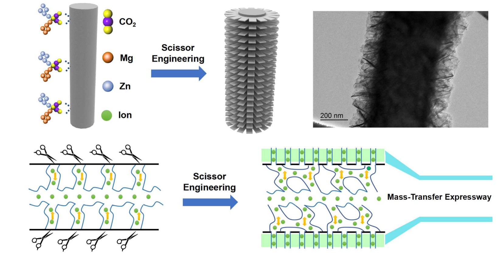 2018级硕士生王庆通过分子剪刀剪切策略实现不同维度碳纳米材料的可控化构建,并对它的裁剪机理进行了详细的阐述。不同于目前广泛研究的表面修饰技术,他们采用分子剪刀打开碳材料的表面,实现分子尺度上的裁剪。在一定的温度条件下,锌蒸气和镁蒸气会进入碳材料的内部,一旦遇到二氧化碳就会形成一把分子剪刀,进而实现碳纳米材料的可控裁剪。测试表明,分子剪刀作用下的碳纳米材料不仅拥有高的比表面积,而且拥有适宜的孔径分布。在PVA/Na2SO4凝胶电解质体系中,器件展现出4.63 mWh cm–3的能量密度(对应功率密度为3520 mW cm–3)。研究者相信,此项研究提出的分子剪刀剪切策略一方面将会为碳纳米材料的革新提供借鉴意义,另一方面将会促进能量存储、传感和环境修复等领域的发展。该研究成果以“Tailoring Carbon Nanomaterials via a Molecular Scissor” 为题发表在Nano Today上。(DOI: 10.1016/j.nantod. 2020. 101033)