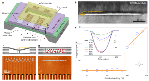毛细凝聚,是我们从教科书中学到的自然现象,通常在接触表面或多孔材料中发生,在我们生活中处处存在,会影响包括摩擦、吸附、润滑、腐蚀等在内的诸多重要性质,也在微加工技术、医药、食品加工等许多工业技术过程中发挥着重要作用,就连小孩子们在沙滩上玩耍堆砌的沙堡,也离不开毛细凝聚。毛细凝聚现象通常由开尔文方程进行科学描述,该方程提出距今已有150余年,能很好地解释在大于10 nm通道中的毛细凝聚现象,这个宽度只有人头发丝的千分之一。然而若想要毛细凝聚发生在环境湿度条件(通常是相对湿度30-50%) 下,通常需要更小(<1 nm) 的通道尺寸,而这个尺寸跟水分子自身大小(大约0.3 nm)相当。在这种情况下,自发凝聚的通道中便只能容纳几层水分子,显然宏观开尔文方程不能继续用于阐述该尺寸下的毛细凝聚现象。实际上,在该尺度下开尔文方程甚至不再具有意义,例如当只有几层水分子存在时,我们无法定义水半月板的曲率半径这一开尔文方程中的重要参数。但长期以来,用于验证开尔文方程适用性的体系受限于表面粗糙度等实验问题难以建立,因此,即使开尔文方程的适用性虽并未得到完全证明,却依然在被大家广泛使用。
