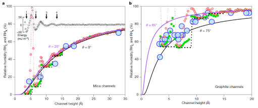 来自曼彻斯特的研究者们通过长时间的努力,采用具有原子级别光滑表面的云母和石墨二维晶体,通过将具有一定原子层数的二维晶体堆叠在两层晶体间,得到了具有原子级别光滑表面的纳米通道,最小的通道只有1个原子层高度,只能容纳一层水分子。该工作证明即使在这样最小的通道里,开尔文方程依旧适用。这是一个很意外的结果,甚至和我们的认知相违背,因为在这么小的维度里,连水分子的结构都是离散的层状结构。“这对我来说很意外,我们期望的是传统理论失效”本文的第一作者杨倩博士说到,“但这个有着百年历史的方程居然依旧成立”;她提到,开尔文方程这种良好的适用性,也同样是偶然的。在发生毛细凝聚的纳米通道中通常会产生超过1000个大气压的负压,超过深海海底的压力,如此巨大的压力可以使通道发生埃 (1埃 = 0.1 nm) 级别的尺寸调整,而这就能够使通道只容纳整数层水分子。正是由于这样的细微调整,使得开尔文方程具有了在该尺度下的广泛适用性。