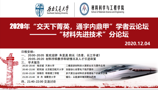 于2020年12月04日晚八点利用腾讯会议平台举办了第四届“交天下菁英,通宇内鼎甲”学者论坛——“材料先进技术”分论坛。