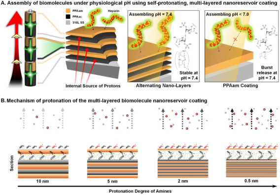 图1. 等离子交替沉积涂层的结构及肝素分子的负载。