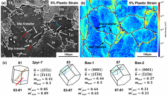 图4:高GND密度的晶界示例及其两侧晶粒的取向和滑移激活情况