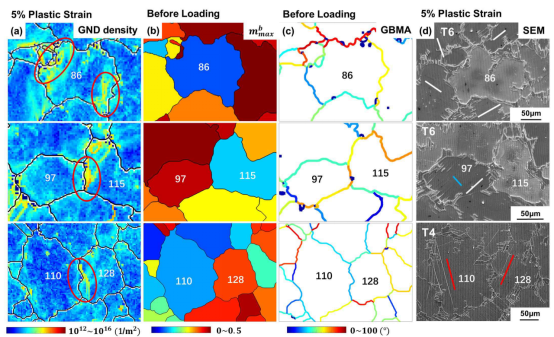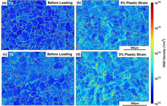 利用EBSD取向差角分析的方法定量研究了变形不均匀性的分布规律及影响因素,发现变形不均匀主要分布在晶界附近,但晶内也同样存在。T6态样品的平均GND密度比T4态大,表明析出相增强了变形不均匀程度。变形不均匀性与周围晶粒的取向以及滑移的激活情况有关。