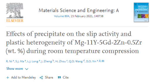 此研究通过定量统计的方法,探究了各个滑移模式的析出强化效果,有助于改进析出相-位错交互作用模型,同时加深了对镁合金塑性变形行为的理解。该研究成果以“Effects of precipitate on the slip activity and plastic heterogeneity of Mg-11Y-5Gd-2Zn-0.5Zr (wt. %) during room temperature compression”为题发表在金属材料领域高水平SCI期刊Materials Science and Engineering: A(中科院1区)。论文合作者主要有南京理工大学周浩副教授,重庆大学郑江教授,上海交通大学王渠东教授。