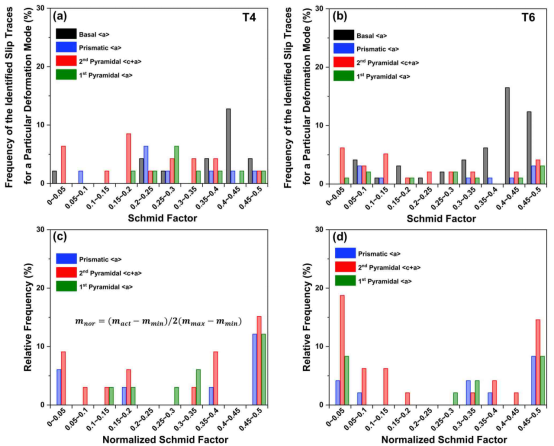 利用滑移迹线分析的方法,分别统计了两样品中各滑移模式的激活规律。结果表明,T4(70.2%)和T6(49.5%)态样品中都激活了高比例的非基面滑移,其中,二级角锥面<c+a>滑移(34.1%)在T4态样品中占主导。经过T6处理后,主导滑移系转变为基面<a>滑移(50.5%),但仍有相当比例的二级角锥面<c+a>滑移(27.8%)被激活。对于激活的滑移系,归一化Schmid因子集中分布在较大和较小两端,其中>0.3的占50.0%,<0.1的占39.6%。归一化Schmid因子较小的滑移系被激活的原因可能是局部应力偏离宏观应力。