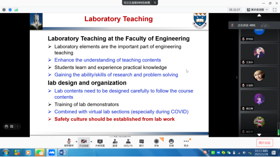 朱旻昊院长代表学院致辞,然后,中心常务副主任刘艳对示范中心2020年度的工作进行了总结汇报。专家认真聆听示范中心的报告后,对示范中心2020年度工作表示认可,对中心建设与发展进行了充分讨论,对中心的工作提出了进一步的指导与建议。同时,专家们审议了示范中心2020年度工作报告及示范中心2021年工作计划,对示范中心下一年度工作进行了指导和规划,并形成了会议纪要。专家们建议中心的实践教学应与一流专业和一流课程有机结合,提升中心的教学能力和水平,加强示范中心的信息化建设,对现有设备更新换代、增加设备台套数以增强学生的实践动手能力等。最后,高唯教授作了关于实验室安全的中英文双语专题报告。