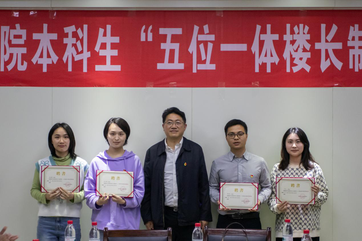 党委在组织召开“为师生办实事”意见征集暨师生交流座谈会的基础上,针对学院本科生人才培养工作面临“两校区办学、本研分离、师生交流不够”等办学实际,根据学院党委副书记章春军同志的提议,学院党委决定从2021年4月开始,正式实施由“学院领导、专家教授、班导师、辅导员、学生党员干部”五个层面分别担任宿舍楼长的“五位一体”楼长工作制,通过走访交流及时了解学生的情况,对接学生需求及时精准帮扶,第一时间解决困难或问题,五个层次共同做好“深入学生、联系学生、服务学生”的园区育人工作,以此引导构建“领导带头、全员重视、师生参与、职责明确、主动作为”的“全员育人”工作格局。