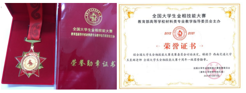 本届比赛是金相技能大赛的举办的第十年,组委会表彰了为该项赛事做出突出贡献的人员。我校王良辉老师因连续带队参加了七届全国金相技能大赛、组织发起四川省金相技能大赛、连续三年参与组织四川省金相技能大赛、并积极努力推进省赛进入四川省教育厅本科学生学科竞赛名录等卓越的成绩,被组委会授予全国大学生金相技能大赛十周年“一级荣誉勋章”。我校高国庆老师因带队参加第一次全国大学生金相技能大赛,被组委会授予全国大学生金相技能大赛十周年“二级荣誉勋章”。