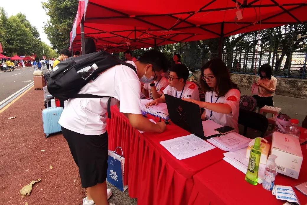 校门,2022年新生报到,现场迎新工作正式开始。