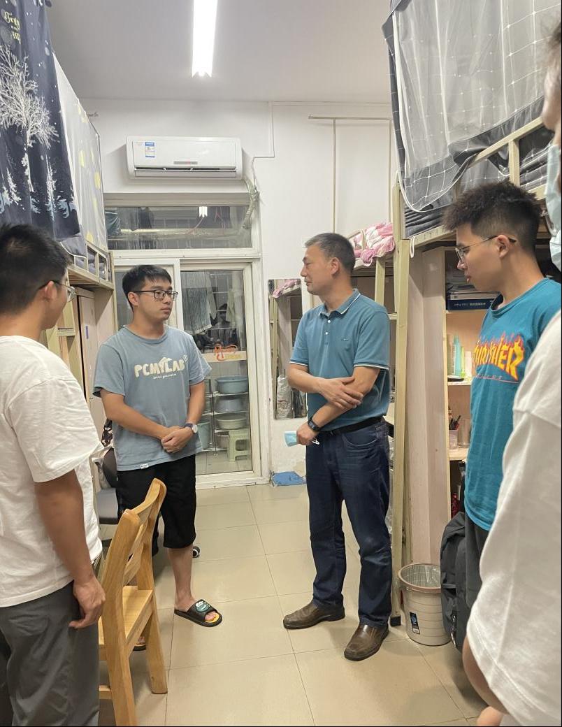 党委副书记章春军和全体辅导员走访学生寝室,第一时间了解学生思想动态以及学习生活需求,询问有无困难,解决学生实际问题;开展对学生宿舍安全、生活保障、学习督促、心理疏导等工作,着重强调防疫安全,叮嘱同学们注意防疫卫生,宿舍通风。