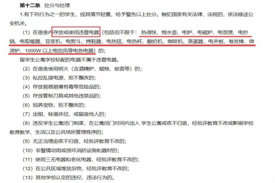 3. 不存放和使用违章电器(包括但不限于:热得快、烧水壶、电炉、电磁炉、电饭煲、电炒锅、电取暖器、豆浆机、电熨斗、烤鞋器、电热毯、电热杯、酸奶机、咖啡机、蒸蛋器、电夹板、卷发棒、微波炉、1000W 以上电吹风等电热电器)。同学们要注意,凡是以发热为主要用途的电器,都是违规的哦。
