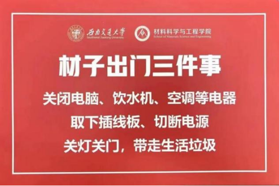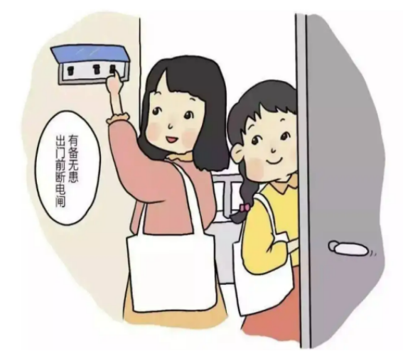 1. 牢记材子出门三件事。关闭电脑、饮水机、空调等电器,取下插线板,切断电源,关灯关门,带走生活垃圾。