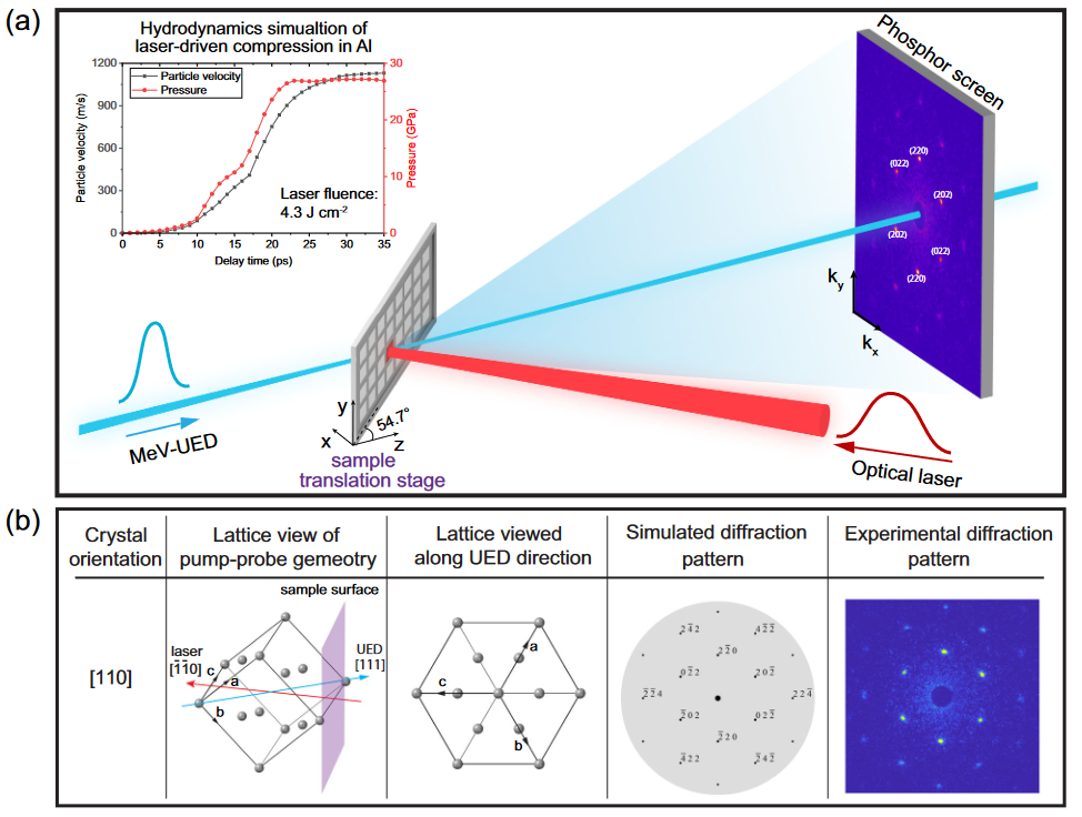 课题组博士后唐敏学(共同一作)通过与SLAC的莫棉珍博士(共同一作)等合作,利用“电子相机”首次捕捉到单晶铝薄膜在激光加载下,晶格从弹性过渡到塑性状态的高分辨图像,并解析了塑性变形的初始阶段。“电子相机”,即兆电子伏特超快电子衍射(MeV-UED)仪器。它通过一束高能电子束捕捉激光冲击加载晶体时的瞬态变化(约五万亿分之一秒),并利用泵浦-探测技术拍摄多张快照。这一连串的图像能很好地反应晶体从弹性进入塑性状态的过程。研究结果表明,单晶铝在达到约25 GPa的弹性极限后,其晶格在5 ps内从纯弹性压缩状态过渡到塑性松弛状态。这些结果在实验上直接确定了位错成核和传播等构成初始塑性的基本缺陷动力学过程。同时,大规模的分子动力学模拟与实验结果展示出很好的一致性,并在原子尺度上提供了关于位错主导塑性的描述。相关研究成果已发表在Nature旗下期刊Nature Communications (10.1038/s41467-022-28684-z)(影响因子:17.694)。