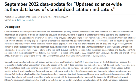 全球前2%顶尖科学家榜单基于Scopus引用数据的系统分析,以总引用量、Hirsch H-index、共同作者修正的Schreiber Hm-index等六个关键因素指标综合评估科学家的科研状态及长期科研表现,遴选出全球前2%的顶尖科学家。本次发布的版本统计数据时间节点为1960-2022年,榜单主要分为“终身科学影响力排行榜(1960-2022)”和“2022年度科学影响力排行榜”两个榜单。