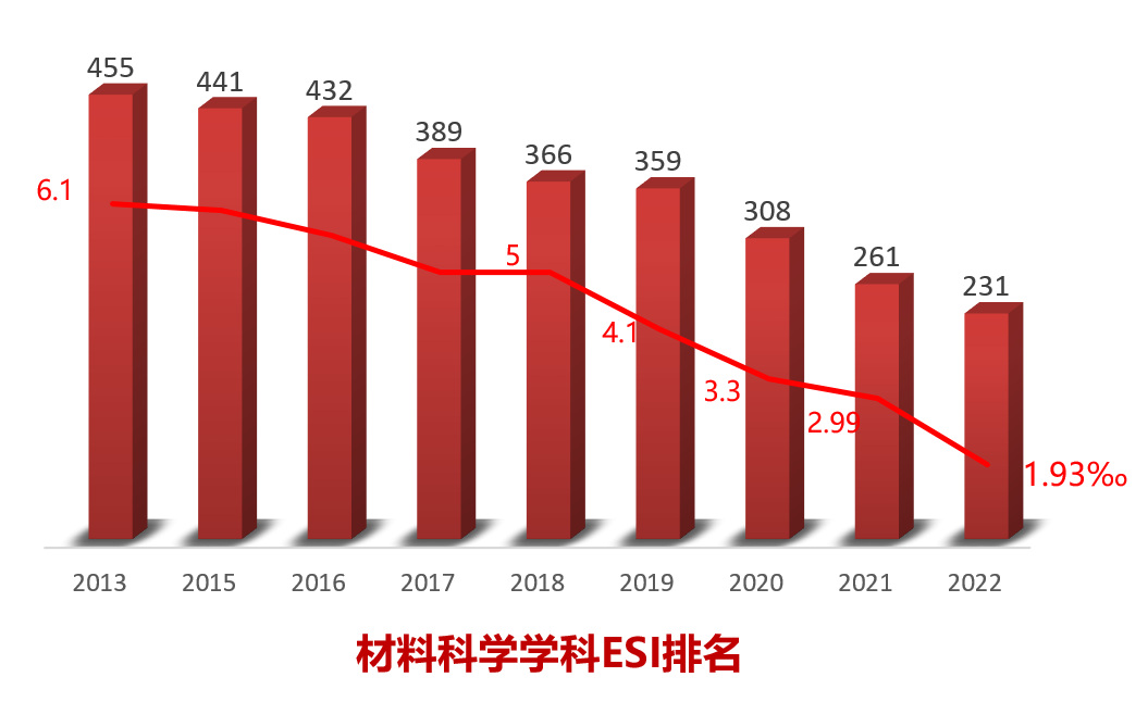 ■ 两个ESI全球前1%学科有进步。材料科学学科较去年同期提升30位,进入2‰行列;化学学科较去年同期提升了111位。入选高被引论文56篇,在全校占比28.67%。