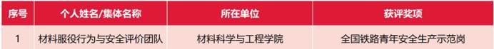 材料服役行为与安全评价团队荣获“全国铁路青年安全生产示范岗”。