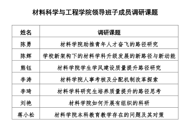 二是明确了调研主题。学院领导班子成员结合新学院发展实际,围绕学科规划、人才引育、教育教学、成果转化等方面深入思考,已明确相关选题。