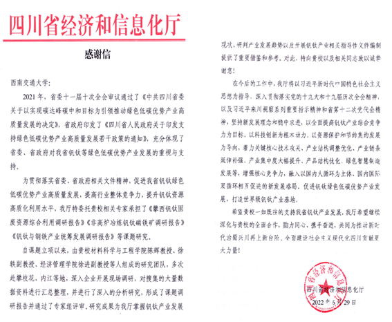 金属材料系立足攀西钒钛稀土综合利用的国家战略,多次赴攀枝花、西昌和内江等地,深入企业开展现场调研,为国家和省市撰写了《非高炉冶炼钒钛磁铁矿调研报告》、《钒钛与钢铁产业统筹发展调研报告》、《攀西固废资源综合利用调研报告》。协助编写中国工程院《四川攀西优势资源综合利用及产业发展战略咨询报告》。参与《四川省先进材料产业“十四五”高质量发展路径研究报告》、《四川省推进钢铁行业“双碳”战略示范研究》等重大课题,为四川发展钒钛稀土新材料及先进制造提供政策建议。建议得到省委省政府、国家发改委批示,获四川省经济和信息化厅发文感谢,策划中国工程院战略研究与咨询(地方院重大)项目获批。