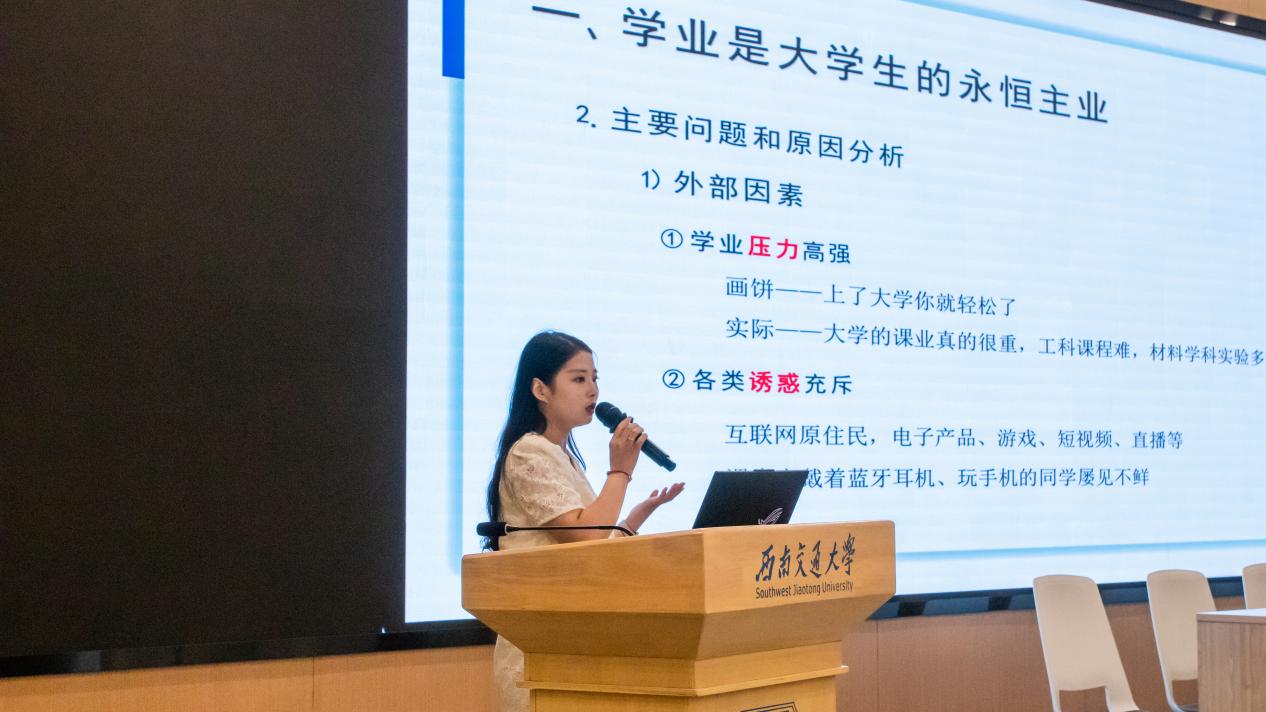 王誉静老师向现场家长们介绍当前的大学生活与学习工作和毕业后去向。她从学业、校园生活、评奖评优政策、共建平安校园和大学生心理健康几个方面,详细介绍了学生的学习生活情况。